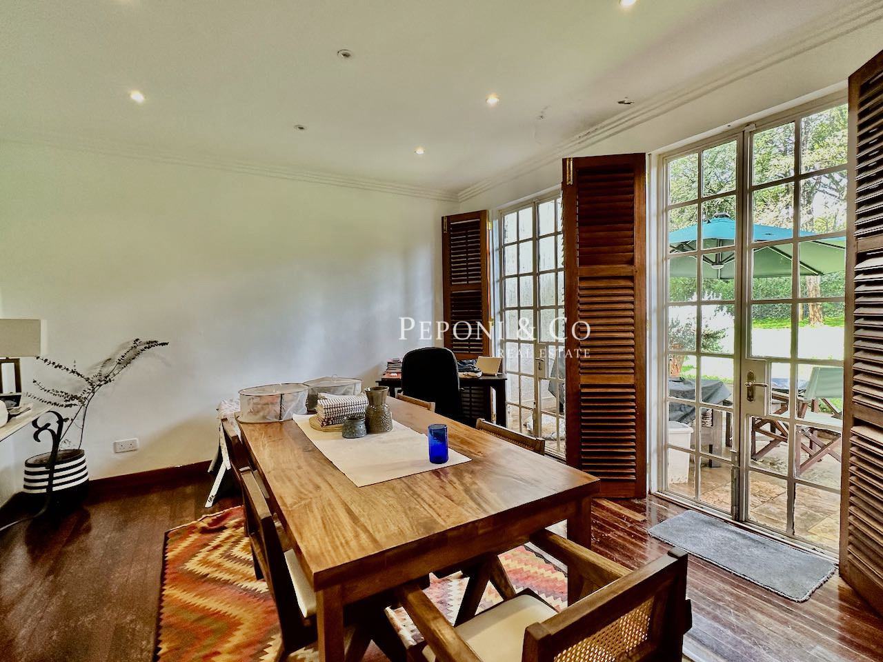 Upon entry, one is received into a generous open-plan living and dining area, bathed in natural light through full-length windows, complemented by elegantly crafted wooden shutters that lend warmth and charm to the space.