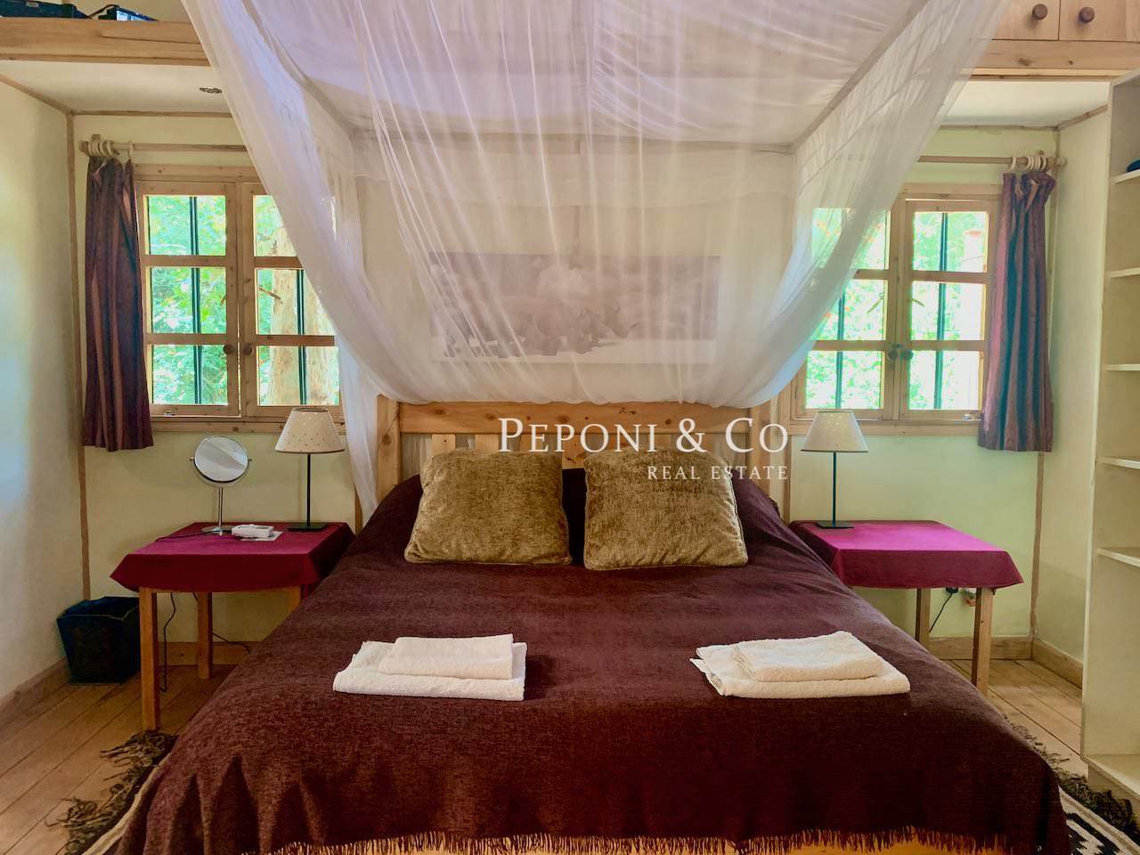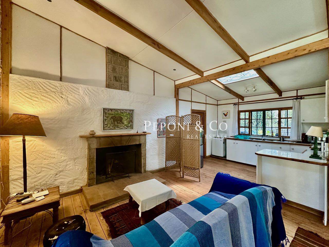 The property has a generous veranda. Open plan living / dining room with a fireplace leading to an open plan kitchen. The master bedroom has an open plan study area (that’s the 0.5 of bedroom!).