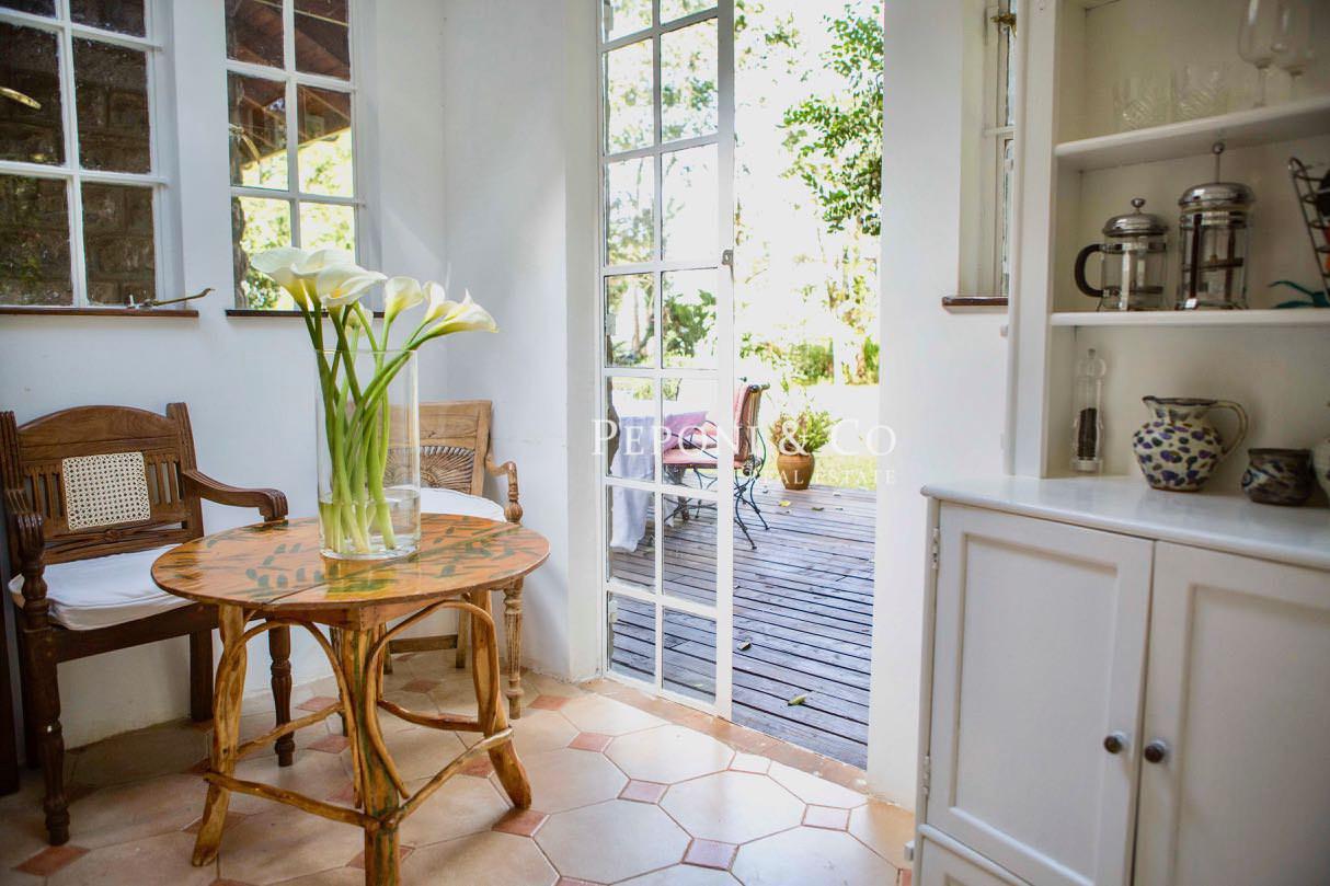 French doors from the kitchen lead out onto a terrace area providing views of the mature garden with plenty of trees providing privacy.